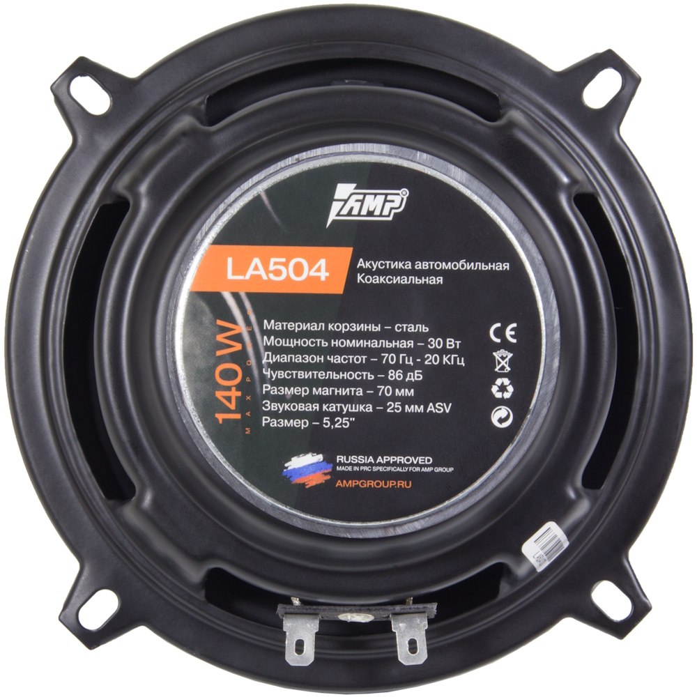 AMP LA 504 — коаксиальная акустика в 13-ти сантиметровом размере. Представляет из себя начальную линейку акустики. Рассчитаны чтобы «играть» от любого головного устройства или не сильно мощного усилителя. Чаще всего используется в простых системах для замены штатных динамиков.