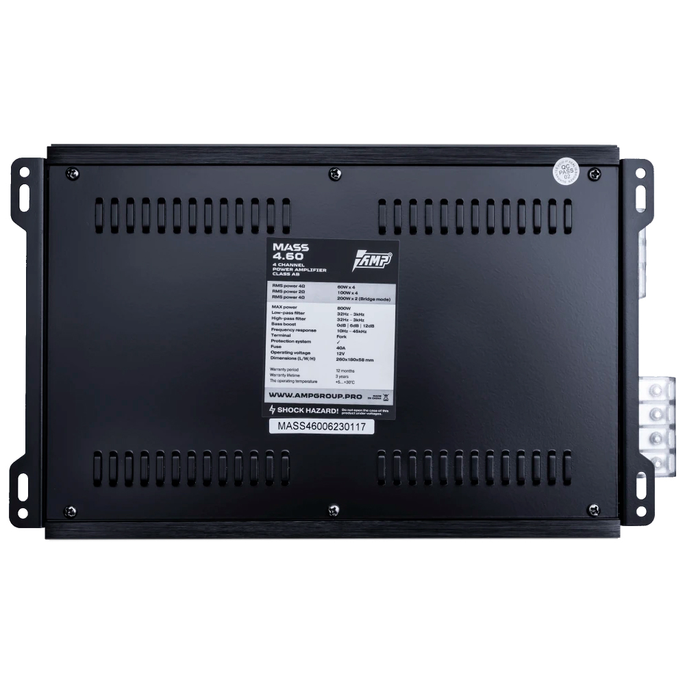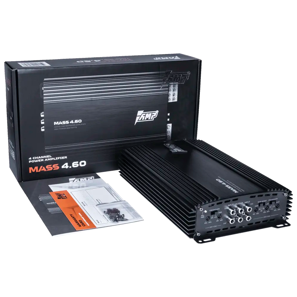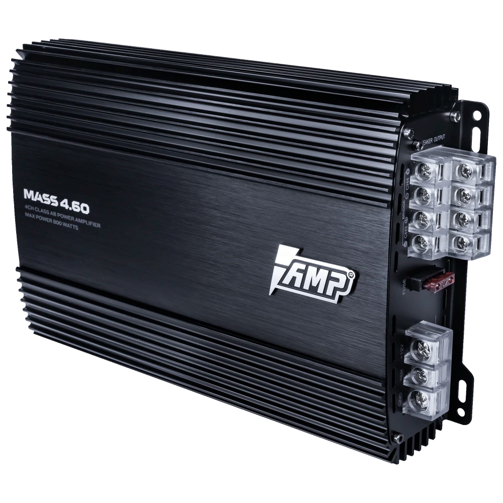 MASS 4.60 пожалуй, самый популярный усилитель из всех представленных новинок. Четыре канала по 60 ватт раскачают любую компонентную акустику начального уровня, а возможность отдать 200 ватт в мостовом режиме позволит подключить к нему простенький сабвуфер. Кроссовер устроен так, чтобы усилитель мог работать с любыми магнитолами и самое главное решать вопросы по канального подключения компонентов.