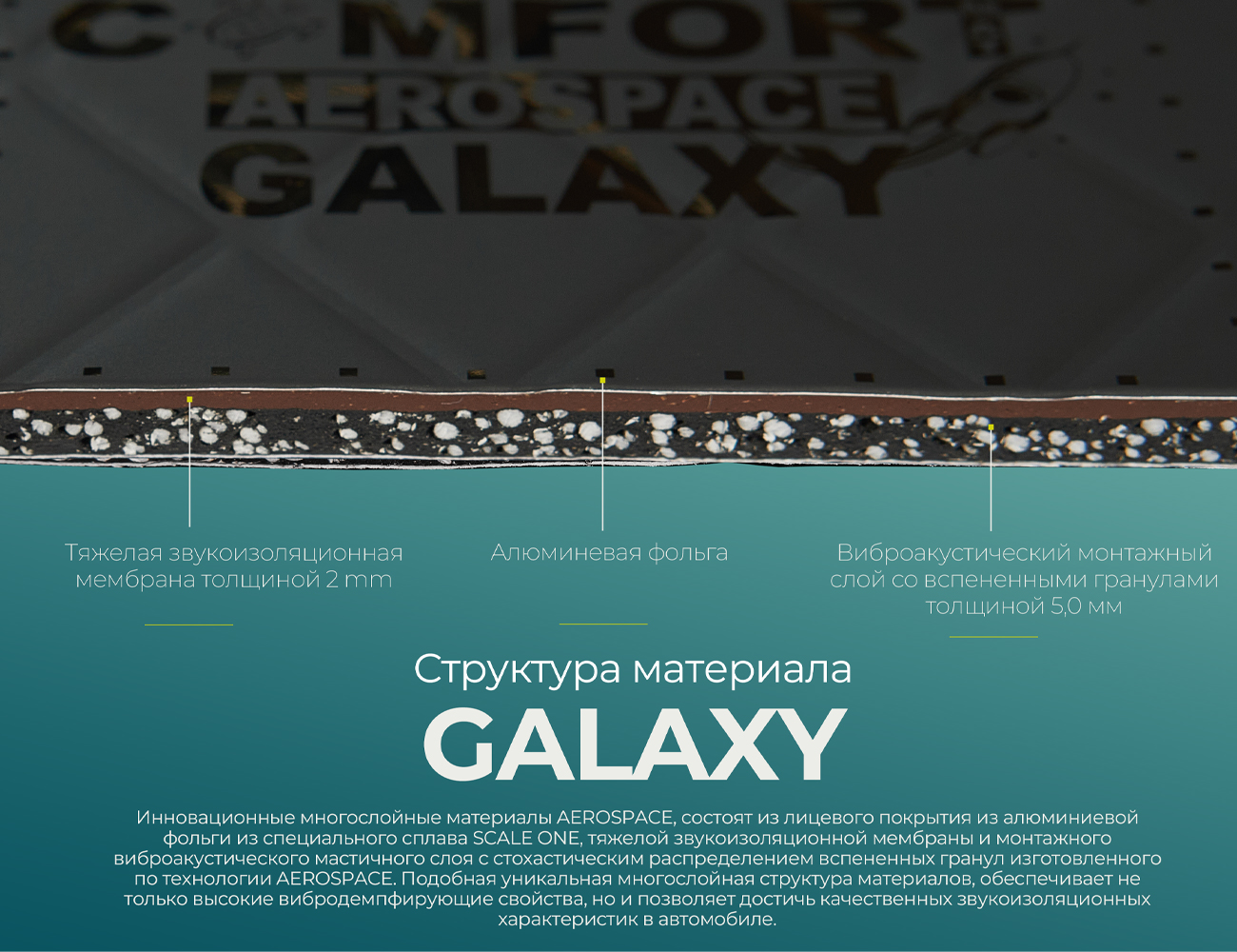 Виброакустический материал ComfortMat GALAXY — новый инновационный материал серии AEROSPACE. Состоит из виброакустической мастичной основы 5 мм толщиной со стохастическим распределением вспененных гранул, тяжелой звукоизоляционной мембраны 2 мм и лицевого покрытия из алюминиевой фольги из специального сплава SCALE ONE.