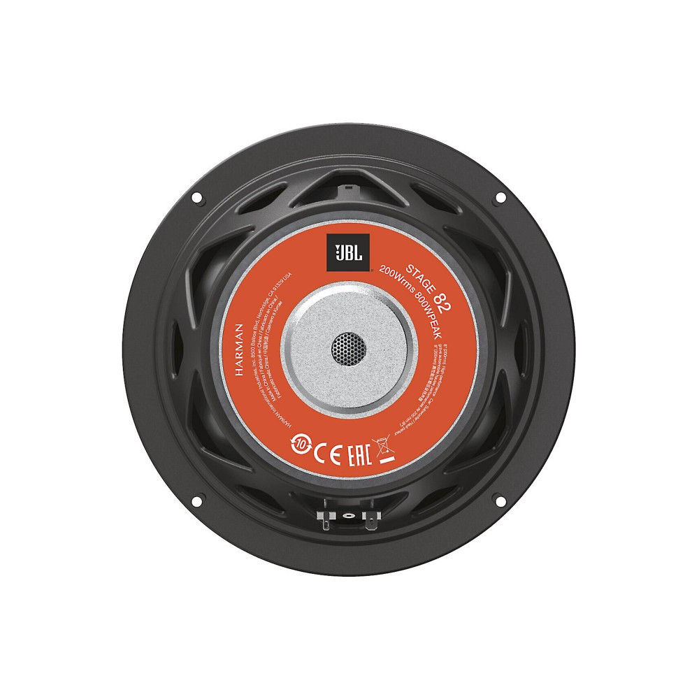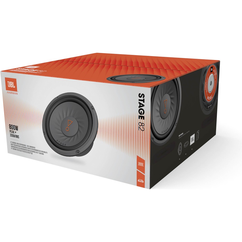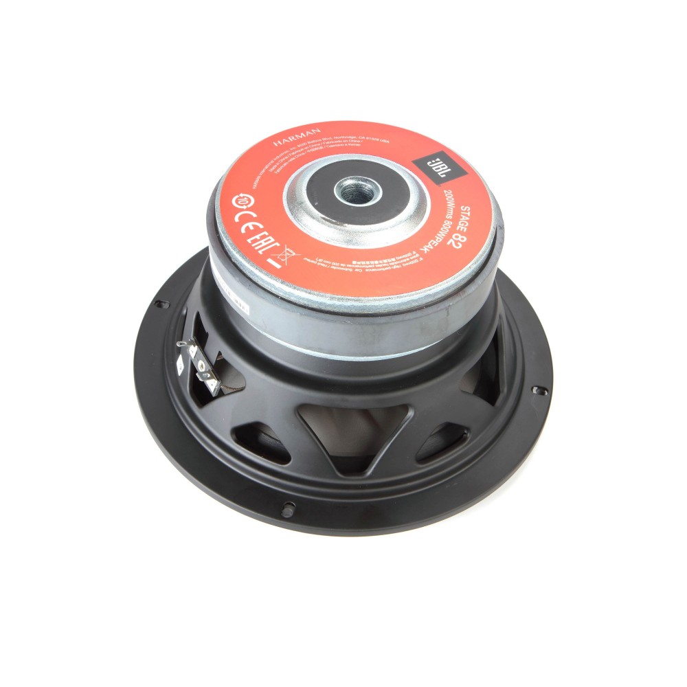 JBL STAGE 82 - это пассивный автомобильный сабвуфер диаметром 8 дюймов, рассчитанный на 200 Вт номинальной и до 800 Вт пиковой мощности, с рабочим диапазоном частот от 38 до 200 Гц.