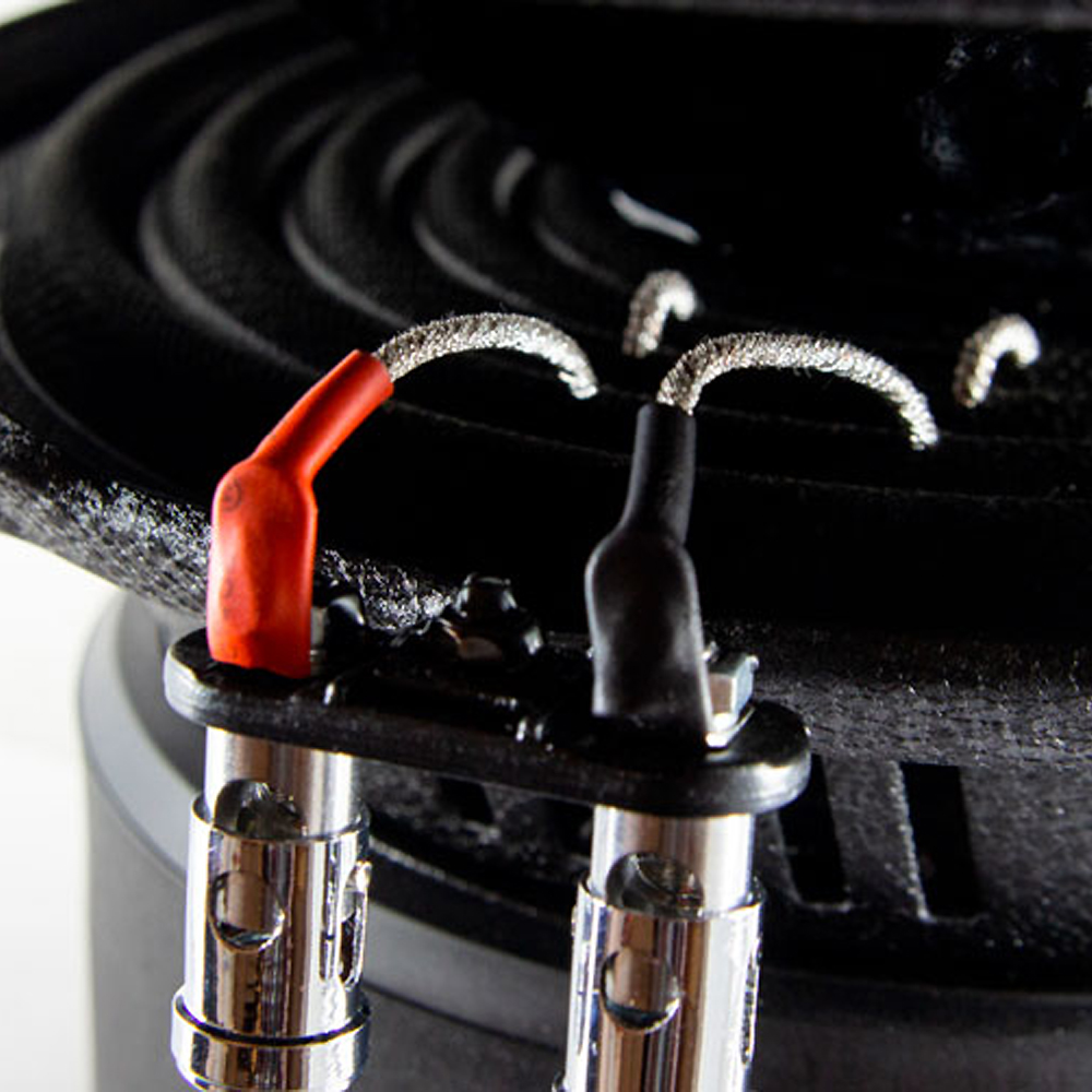 Звуковая катушка имеет двойную обмотку, номинальный импеданс сабвуфера 2+2 Ом. Вы можете соединить обмотки параллельно и получить импеданс 1 Ом, или последовательно для получения импеданса 4 Ом. Такая гибкость даёт возможность строить басовое звено на одном или нескольких динамиках, выбирая нужный вариант включения для оптимального согласования с выбранным вами усилителем.