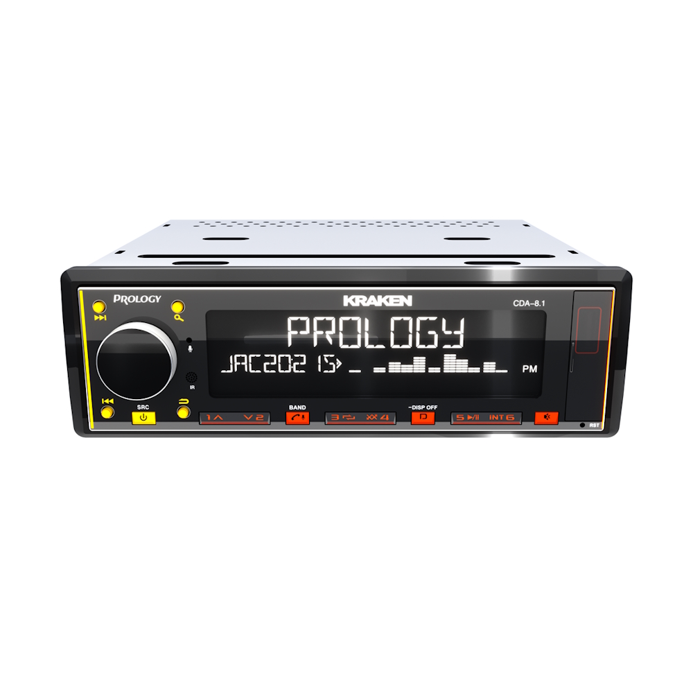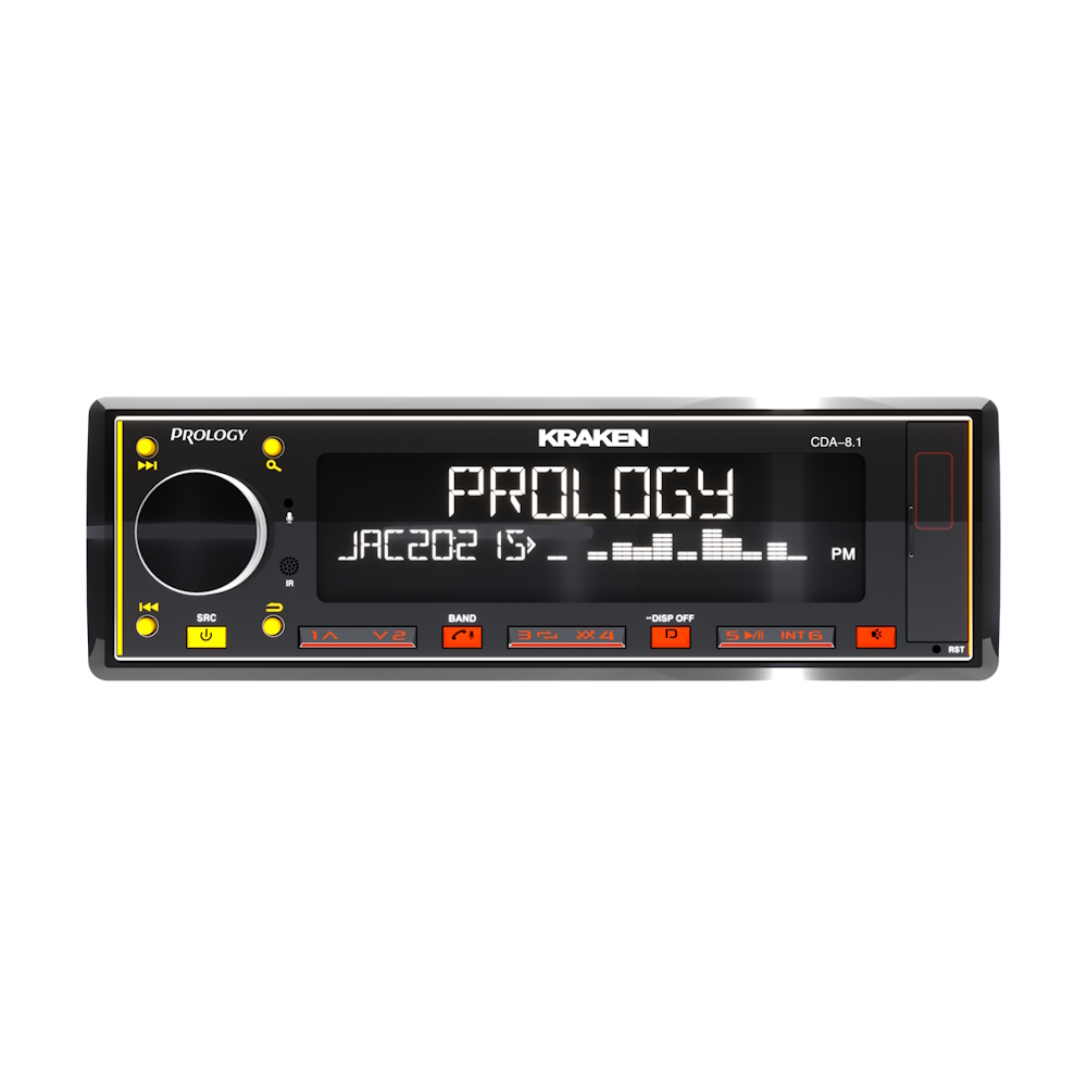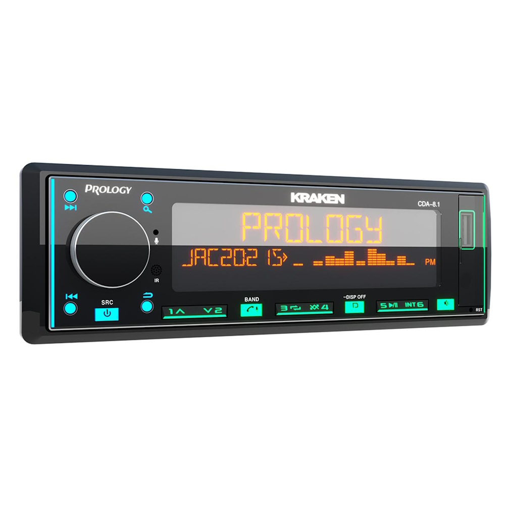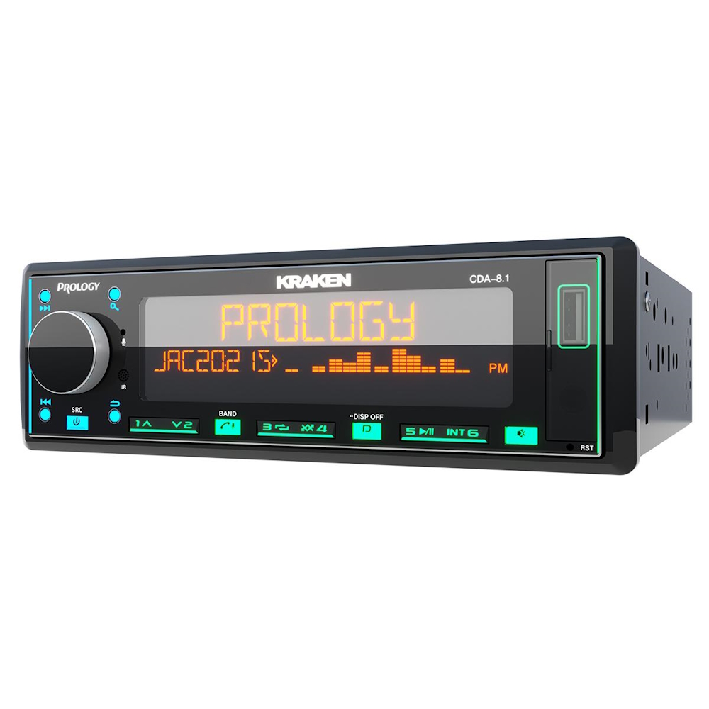 PROLOGY CDA-8.1 KRAKEN — FM / USB / ВТ ресивер с Bluetooth, стандартного размера 1DIN, который обеспечивает прием радиостанций в диапазонах FM/УКВ, воспроизведение аудиофайлов MP3, WAV и FLAC форматов, записанных на USB-накопители, передачу звука с внешних источников через линейный аудиовход и беспроводной интерфейс Bluetooth (ver. 4,2). Кроме того, устройством можно управлять с помощью приложения, установленного на Ваш смартфон с операционной системой Android/iOS