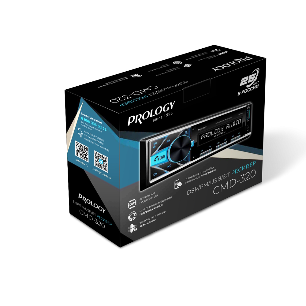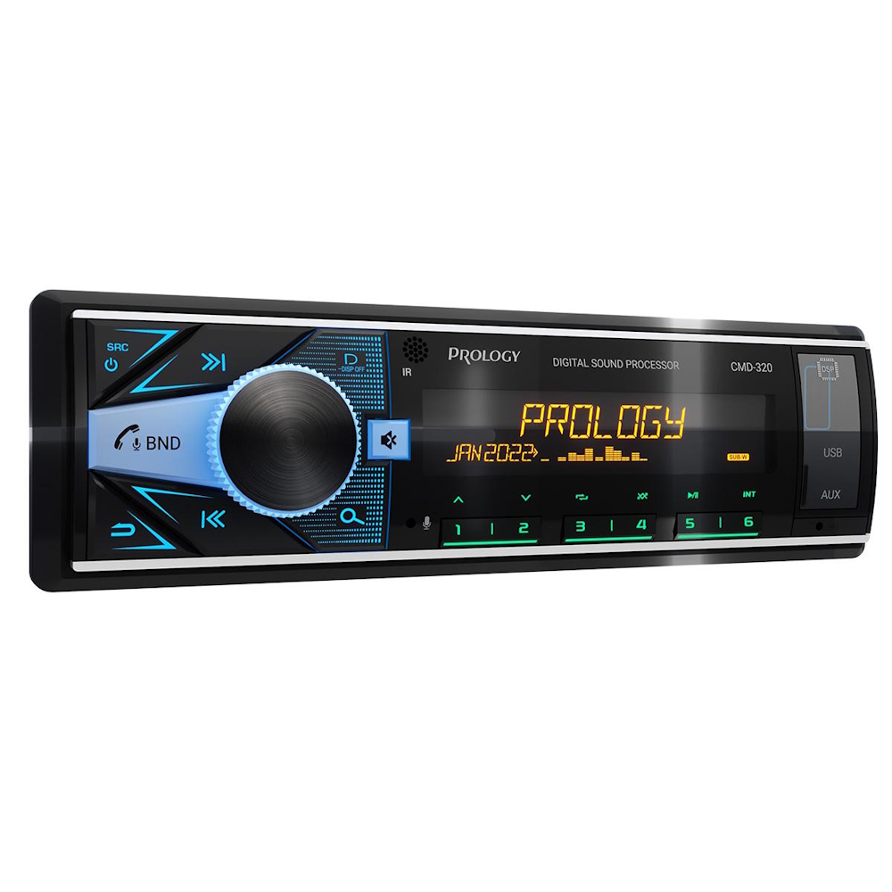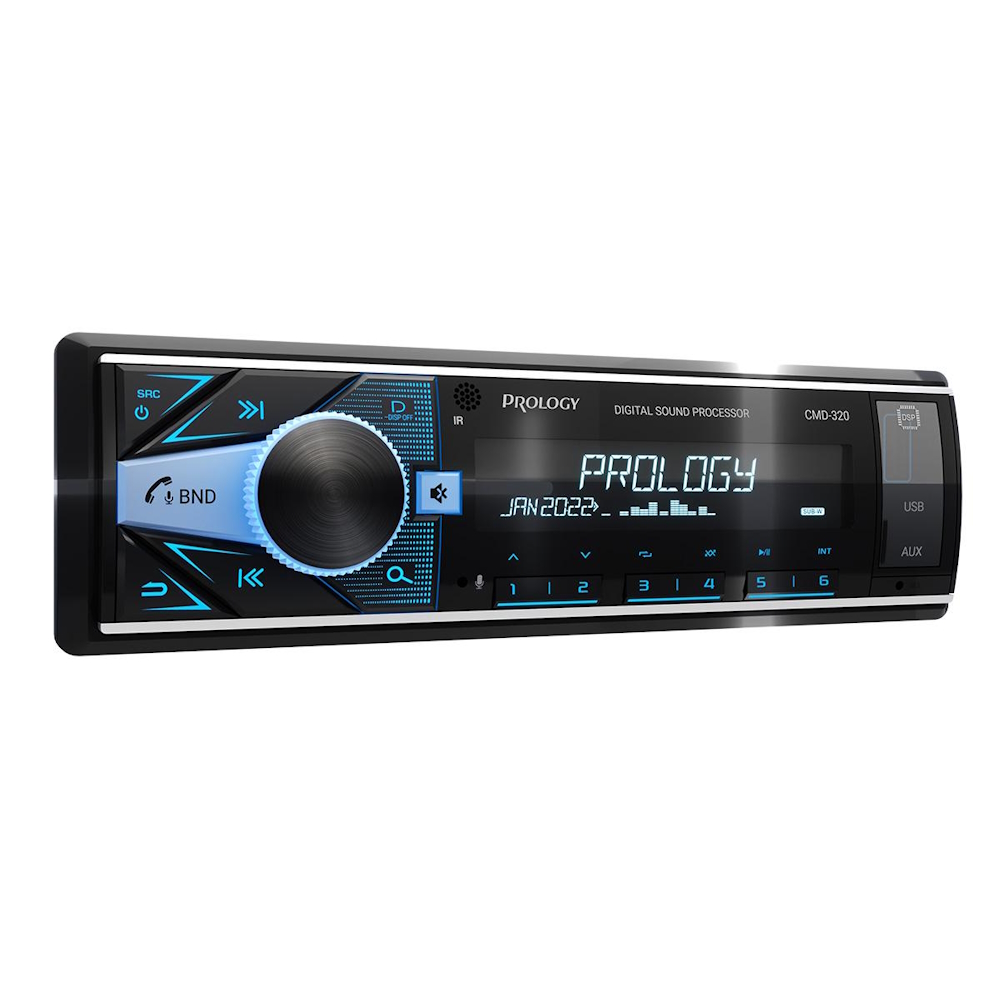 PROLOGY CMD-320 — FM / USB ресивер с Bluetooth® и встроенным DSP - аудиопроцессором, стандартного размера 1DIN, который обеспечивает прием радиостанций в диапазоне FM / УКВ / AM и воспроизведение аудиофайлов MP3, WAV, и FLAC форматов, записанных на USB накопители, передачу звука с внешних источников через линейный аудиовход и беспроводной интерфейс Bluetooth®. Поддерживается управление мобильным телефоном через интерфейс Bluetooth® (ver. 4,2).