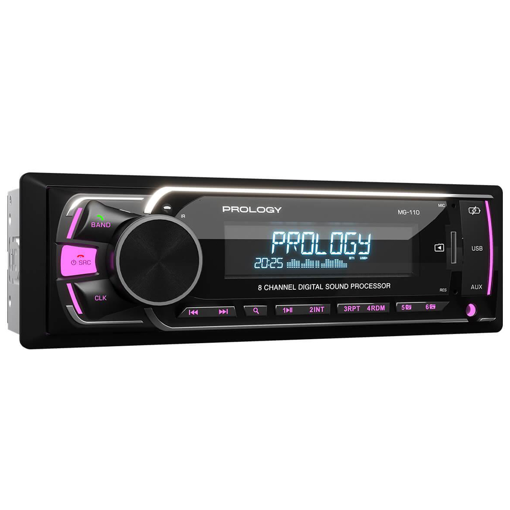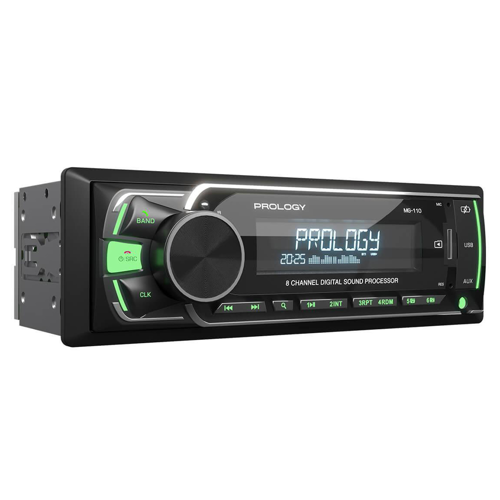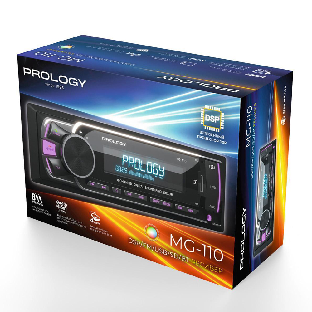 Prology MG-110 — FM/USB/SD ресивер с Bluetooth и встроенным 8-канальным DSP-процессором AsahiKASEI AK7604VQ, стандартного размера 1DIN, который обеспечивает прием радиостанций в FM-диапазоне и воспроизведение аудиофайлов форматов MP3, WAV, WMA и FLAC, записанных на USB-накопители или карты памяти microSDXC, передачу звука с внешних источников через линейный аудиовход и беспроводной интерфейс Bluetooth. Поддерживается управление мобильным телефоном через интерфейс Bluetooth 5.1. Устройством можно управлять при помощи мобильного приложения PROLOGY MUSIC, установленного на смартфон с операционной системой Android или iOS. Максимальная выходная мощность 4 х 55 Вт, поддержка акустики 4 или 8 Ом.