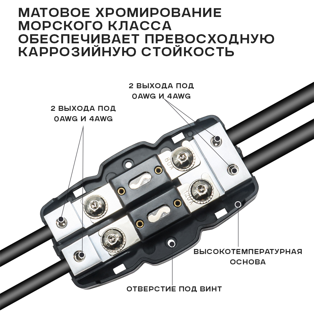 Кованая и обработанная латунная конструкция для максимальной передачи мощности. Матовое хромовое покрытие морского класса для превосходной коррозионной стойкости. Основание и крышка из высокотемпературного поликарбоната обеспечивают изоляцию и защиту. Разветвление основного провода питания для подключения нескольких усилителей