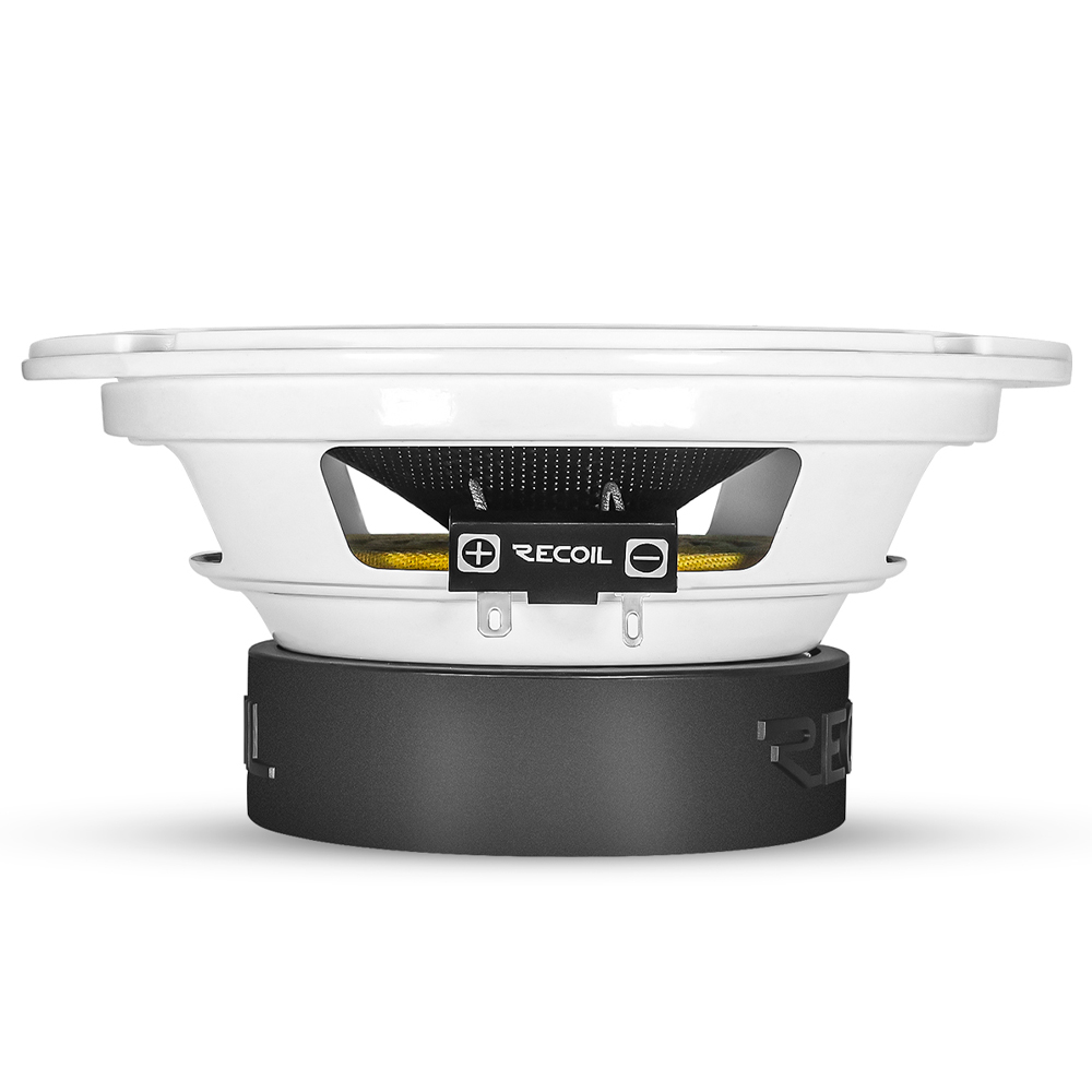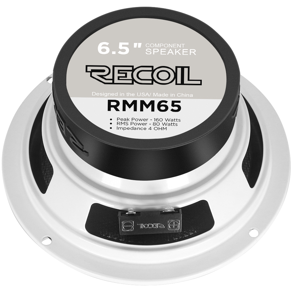 Recoil RMM65 – компонентные акустические системы диаметром 6,5", созданные для замены штатных динамиков с повышенными требованиями к качеству баса и детальности звука. Эти динамики оснащены высокотемпературной 1,2-дюймовой звуковой катушкой из каптона, что обеспечивает отличную перегрузочную способность и надежность при работе на высокой мощности. Диффузоры из плетеного стекловолокна в сочетании с бутилкаучуковым подвесом дают глубокий, упругий бас и точную отдачу на средних частотах. Шелковый купольный твитер с увеличенной звуковой катушкой эффективно рассевает тепло, обеспечивая чистое и комфортное звучание верхов. Возможность трехуровневой настройки твитера позволяет адаптировать звук под акустику салона и предпочтения слушателя. Эти динамики легко подключаются к усилителю и прекрасно сочетаются с задней акустикой Recoil RMX65, формируя сбалансированную аудиосистему.